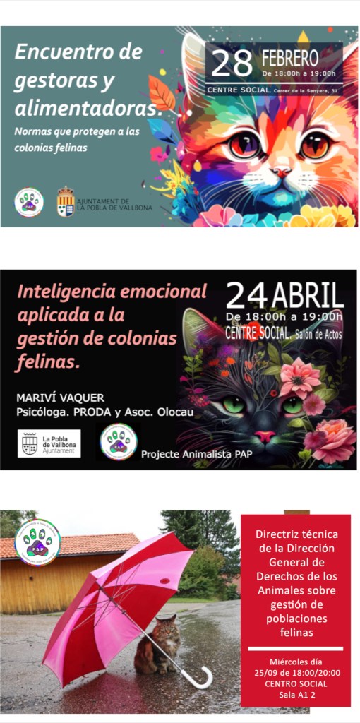 Desde nuestra asociación, ofrecemos formación continuada para todas las personas que gestionan colonias felinas, enfocándonos en nuevas normativas que no solo garantizan el bienestar de los gatos, sino que también promueven la convivencia armoniosa con la comunidad vecinal. Esta formación incluye talleres prácticos, sesiones informativas y asesoramiento personalizado para asegurar que cada gestor esté completamente preparado y actualizado ante los cambios legislativos, así como también para compartir buenas prácticas y experiencias que contribuyan al cuidado y manejo efectivo de estas colonias.
